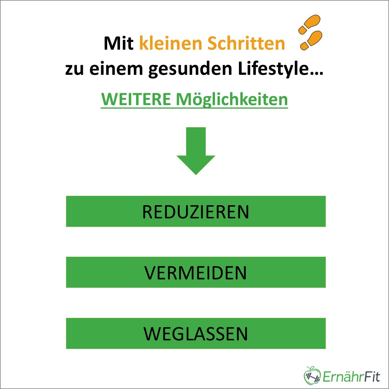 Hier ist es einfacher, sich gleich passende Alternativen zu suchen und beide Kniffe, Reduzieren und Austauschen, mit einander zu verbinden. Das Vermeiden und Weglassen von bestimmten Lebensmitteln oder Lebensmittelkombinationen kann schon eher eine Herausforderung werden. Hier kommt es auf die jeweilige Änderung an. Den Löffel Zucker im Kaffee wegzulassen ist natürlich einfacher (Okay, am Anfang vielleicht nicht – Es klappt aus eigener Erfahrung sehr schnell.), als wenn man bestimmte Lebensmittel komplett weglässt.